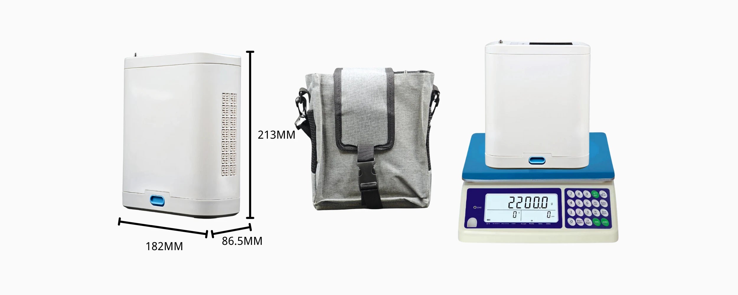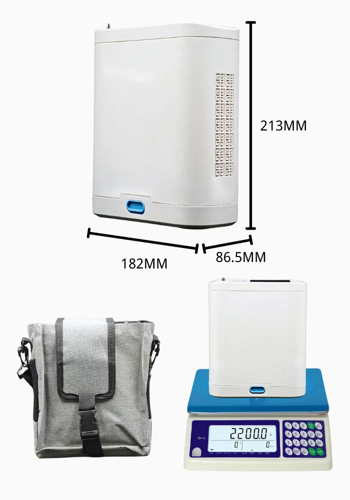 Der tragbare Sauerstoffkonzentrator BE12 wiegt nur 2,2 kg und misst lediglich 182 mm (L) × 86,5 mm (B) × 213 mm (H). Er wird mit einem kostenlosen Rucksack geliefert, ist leicht zu tragen und eignet sich perfekt für den Außeneinsatz. Sagen Sie Tschüss zu sperrigen Geräten – nehmen Sie diesen tragbaren Sauerstoffkonzentrator einfach überallhin mit!